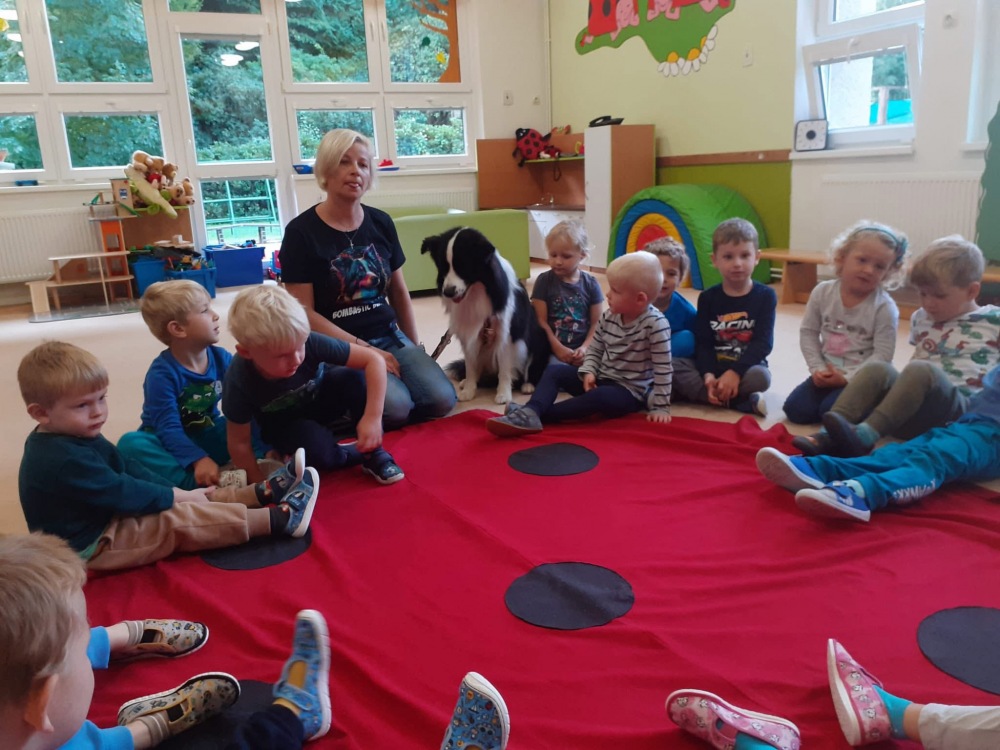 Začal nám nový školní rok, pozvolna adaptujeme nové děti, vyrobili jsme si berušku s fotkou. Seznamovali jsme se s režimem dne. Užili jsme si i 1.pejskový den- celoroční projekt s Badym, Pejsku vyprávěj, -pravidlo kamarád. Začali jsme si povídat o podzimu.