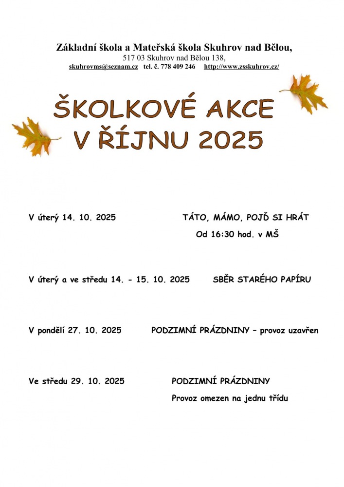 Z důvodu vysokých provozních nákladů v budově mateřské školy a jídelny je navrženo přerušení provozu o podzimních prázdninách v termínu 27. 10. 2025. Ve středu 29. 10. 2025 bude provoz přerušen z důvodu celodenní odstávky vody.